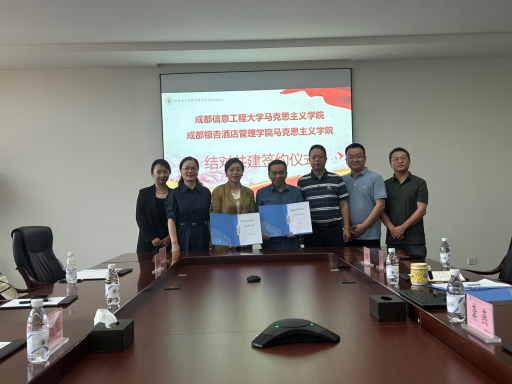 【本网讯】根据省教育厅安排,我校马克思主义学院和成都银杏酒店管理学院马克思主义学院对口共建。5月14日上午,结对共建协议签字仪式在成都银杏酒店管理学院举行,成都银杏酒店管理学院党委副书记龚燕、马克思主义学院院长李元光、院长助理李聪,我校马克思主义学院党委书记谢清明、院长丁小珊、副院长孙莎岚、组织员戴丽红参加签字仪式,丁小珊和李元光代表双方学院签署协议。签字仪式由李元光主持。