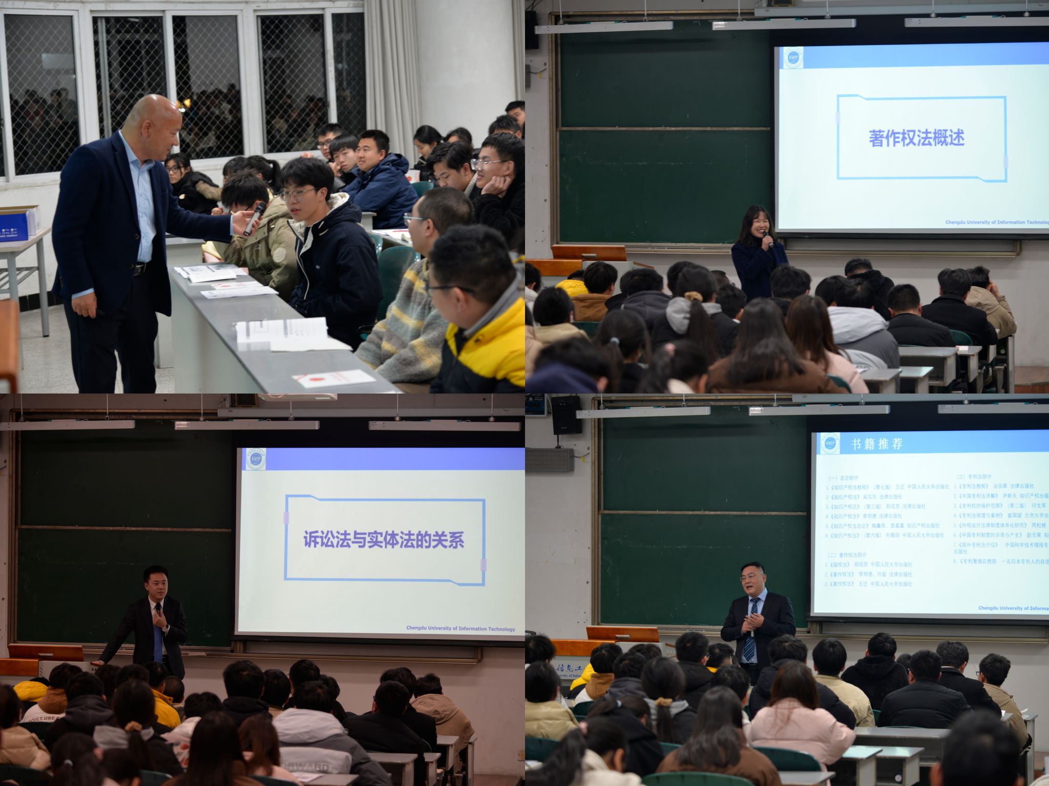 泰和泰律师事务所高级合伙人黄春海律师、四川宗华律师事务所高级合伙人伍姝茜律师、泰和泰律师事务所合伙人谢执胜律师凭借知识产权服务工作中的深厚理论功底和丰富实战经验,结合多元化的典型案例,向学子们生动讲授了涵盖法律基础知识、著作权法概述、商标权法概述、反不正当竞争法概述、植物新品种权和集成电路布图设计专有权概述、知识产权行政确权及知识产权行政、民事、刑事诉讼等内容的《知识产权相关法》知识,呈现了一堂别开生面的有趣课程。