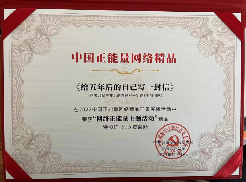 【本网讯】近日,由中央网信办主办的2022中国正能量网络精品征集展播活动揭晓结果,经过初选、专家审核评议、网络展播投票、终选以及结果公示,学校团委联合团省委、川观新闻共同开展的《给五年后的自己写一封信》活动获评“中国网络正能量主题活动”精品。
