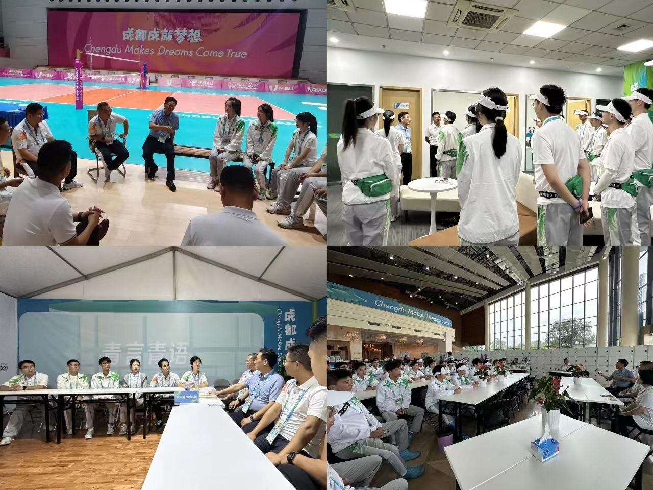 【本网讯】7月24日,学校党委副书记马洪江带队前往成都大运会双流赛区排球训练馆、网球馆、水球馆、射箭馆等场馆看望慰问我校在岗志愿者。学校党委办公室、校长办公室、体育部、校团委等部门负责人陪同参与。