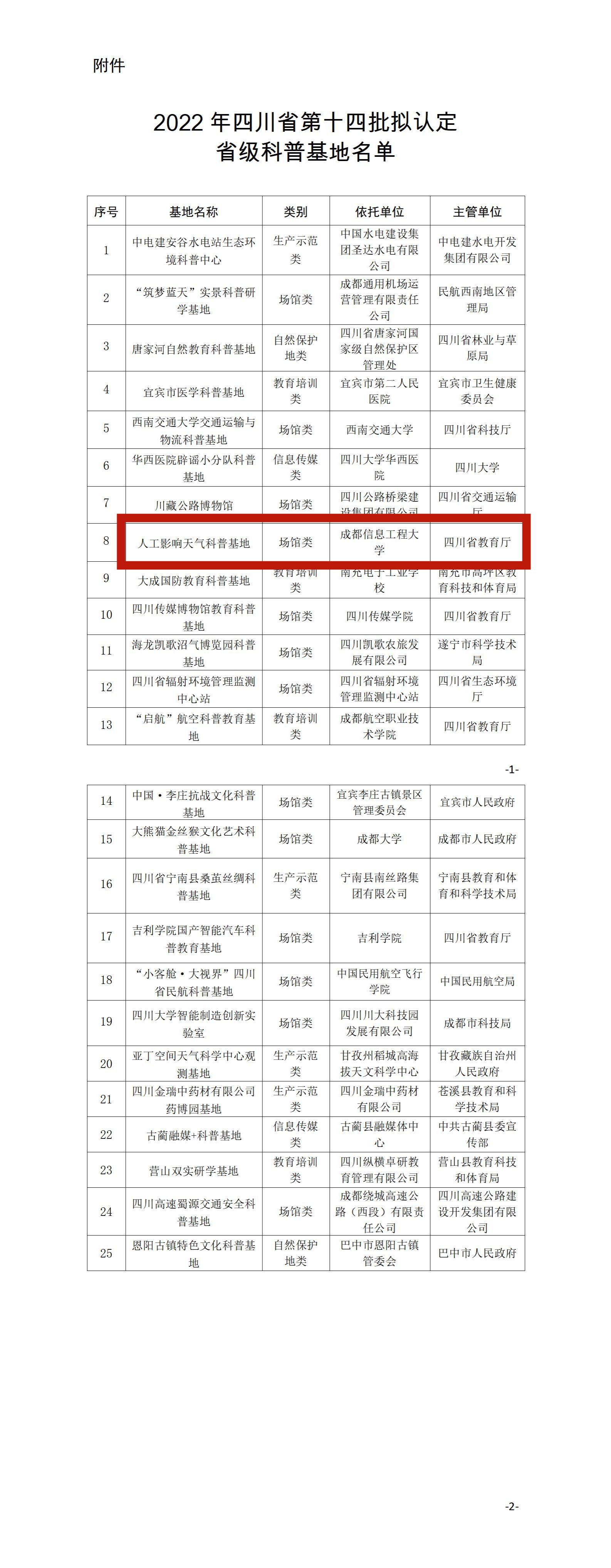 【本网讯】近日,四川省科学技术厅、四川省委宣传部和四川省科学技术协会组织开展了2022年四川省第十四批省级科普基地的认定工作。依托“中国气象局-人工影响天气联合研究中心(以下简称人影研究中心)”等相关平台申报的“人工影响天气科普教育基地”获批四川省科普基地,我校在气象科技领域又新增一省级科普平台,将有力扩大我校在气象防灾减灾等方面的科普影响力。