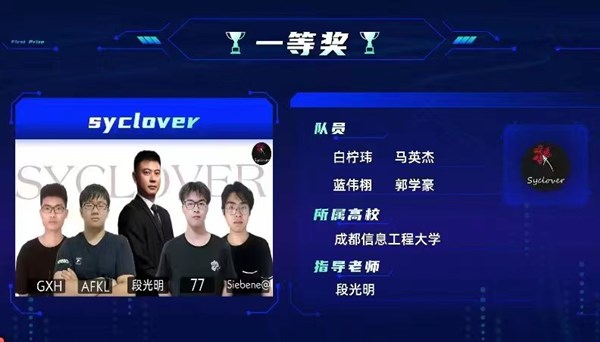 我校网络空间安全学院三叶草安全技术小组的syclover和syc1over两支战队,经过4个多月的精心准备、积极备战,历经初赛和分区赛后,两支战队分别以西南赛区分区赛第一、二名的成绩同时晋级了由南开大学承办的全国总决赛。在总决赛中,两支战队不负众望,双双斩获了全国一等奖;同时,syclover战队还荣获了网络安全挑战创新单项奖。