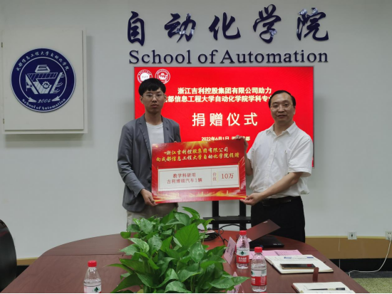 【本网讯】为进一步发挥校企协同育人的合力,强化实践育人环节,提高在校学生的职业素养和就业竞争力。6月1日上午,自动化学院在信息楼104会议室举行了与浙江吉利控股集团的校企合作捐赠仪式。吉利控股集团校园全国渠道总监余琪、校园西南理大区经理张健豪参加仪式,自动化学院党委书记胡雪飞、院长张葛祥、党委副书记张勇,团委书记田媛参加了仪式。