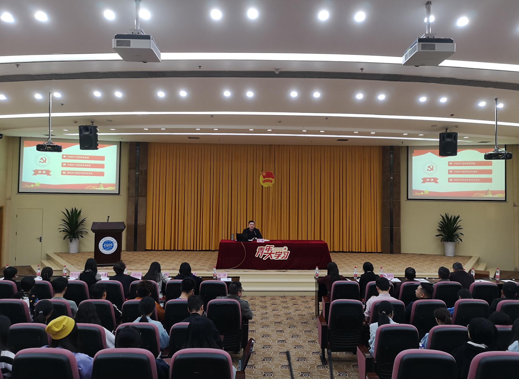 【本网讯】11月12日晚,我校2020年“青年马克思主义者培养工程”大学生新生骨干培训班专题团课在航空港校区国际会议厅举行。省纪委监委驻校纪检监察组组长,学校党委副书记、纪委书记雷超作了题为《充分认识中国特色社会主义制度最大优势是中国共产党领导》的主题报告。纪委办公室、纪委纪检监察室、马克思主义学院、校团委负责同志,各学院党委书记、副书记,各学院团委书记,第十二期“青马工程”新生骨干培训班全体学员300余人聆听了报告。报告会由校团委书记丁恒康主持。