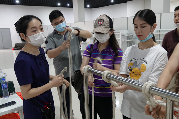 参观体验结束后,在讲解员的指导下,参观人员还接受逃生绳索打结的培训和演练。