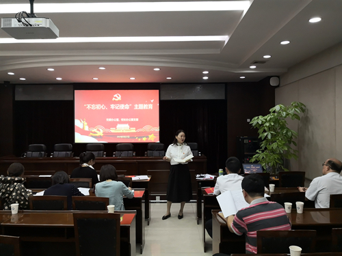 段黔冰同志传达了学校党委《“不忘初心、牢记使命”主题教育实施方案》及“我和我的祖国”主题党日活动要求。她谈到,当前系统、深入学习习近平新时代中国特色社会主义思想是加强党的基层组织建设,增强党组织凝聚力和战斗力的必然要求,也是广大党员提高政治意识和工作能力的内在需要,希望全体党员积极行动起来,通过集体学习和自主学习相结合,分享学习和讨论学习相结合,书本学习和网络学习相结合等多种方式将学习活动引向深入,为查找问题、整改提高打下坚实基础。