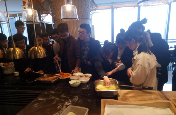 在酒店工作人员的带领下。同学们分为两组,依次参观了酒店的前厅部、客房部和餐饮部,并亲自参与尝试了餐饮部的餐饮摆台以及制作披萨的过程。