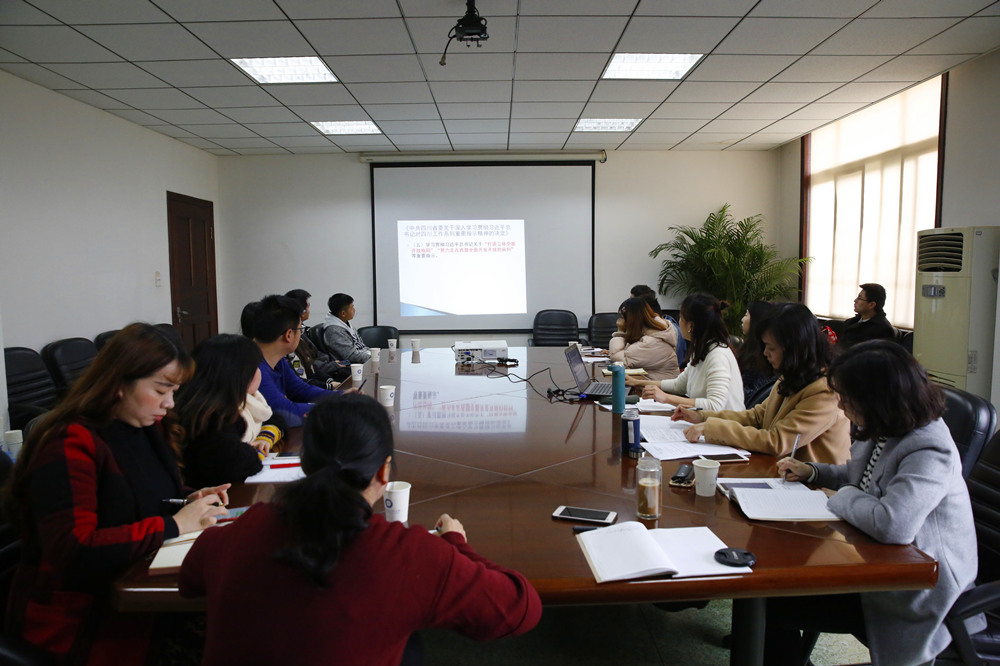 孙莎岚传达了省委十一届二次、三次全会以及全省教育大会精神,重点就“四川在全国发展大局中具有重要地位”“着力推动经济高质量发展”“牢牢扭住经济建设这个中心”“推动城乡区域协调发展”“扎实开展创新创造”“打造立体全面开放格局”“努力走在西部全面开发开放的前列”“坚定不移打赢脱贫攻坚战”“牢固树立以人民为中心的发展思想”“让四川天更蓝、地更绿、水更清”“坚定推进依法治理”和“深入推进全面从严治党”等重要内容进行了详细解读。她提到,自古以来成都就是中国内陆的三大经济带的交汇点,自先秦、汉唐、三国两晋南北朝一直到当今都具有非常重要的历史地位,是内陆的战略高地和三大经济带交汇的枢纽。她表示,作为高校教师,不但要为人师表,更要严于律己,潜心教书、精心育人,为治蜀兴川再上新台阶贡献力量。