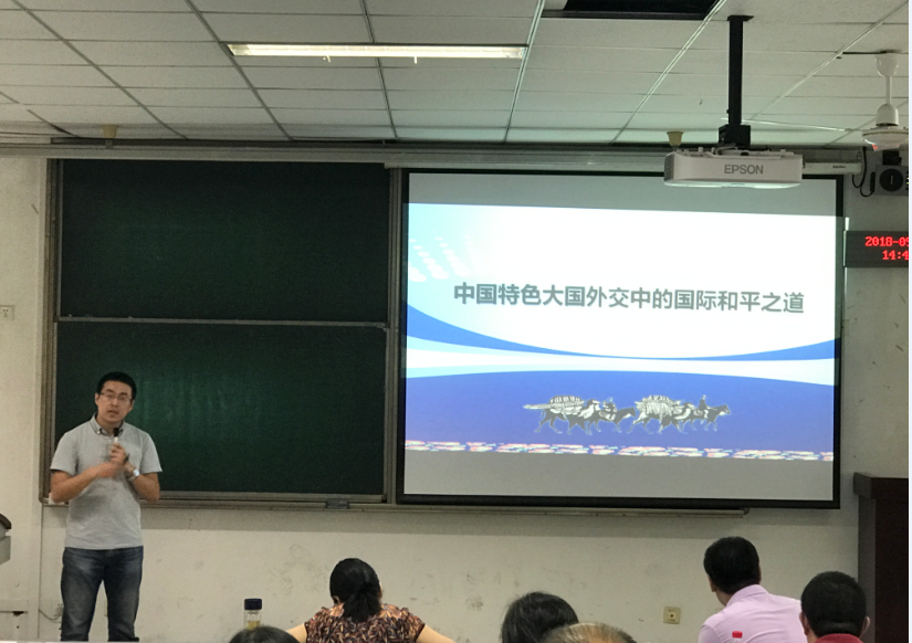 会议邀请了 “2018年第四届全国高校青年教师教学竞赛奖思想政治课专项组”一等奖获得者西南财经大学马克思主义学院王翔宇博士分享了他参赛和教学的经验。他授课的主题为《中国特色大国外交中的国际和平之道》,结合国际和平建设的历史,王翔宇以严密的逻辑,清晰的思路,从均势、结盟、国际法和势力划分等四个方面来阐述了大国关系的演变与发展。参会老师在教学观摩中深受启发。