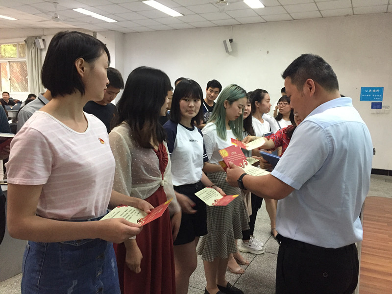 林细俤、姜艳为过政治生日的党员同学分别赠送了“政治生日”贺卡、政治生日礼物——《习近平在北京大学师生座谈会上的讲话读本》和学习笔记本。