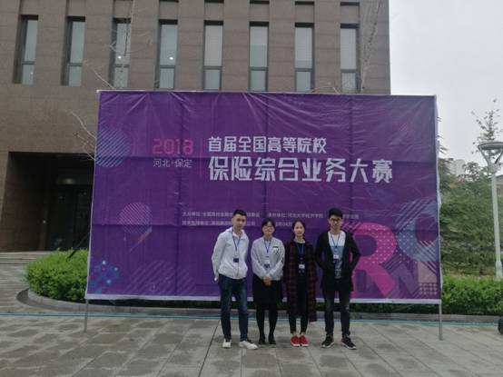 4月21-22日,全国高校金融创新竞赛之首届全国高校保险综合业务大赛在河北大学举行,包括河北大学、广东财经大学、福建师范大学等全国48所高校的200余名学生参加了此次比赛。经过校内选拔赛,我校由滕磊老师带领金融工程和财务管理专业的四名同学组成的代表队参加了此次比赛。最终,四位同学进入了互联网+保险创新设计竞赛环节,获得优秀奖,王源源、孙瑞和李欣怡三位同学获得了个人三等奖。