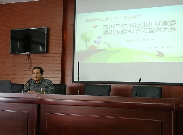 【本网讯】为深入学习贯彻习近平新时代中国特色社会主义思想和党的十九大精神,深刻领会习近平总书记来川视察时的重要讲话精神,3月16日中午,管理学院在1213会议室召开全院学生党员大会,专题学习宣讲“习近平总书记来川视察重要讲话精神”。全体学生党员、辅导员老师、部分教师党员参加。