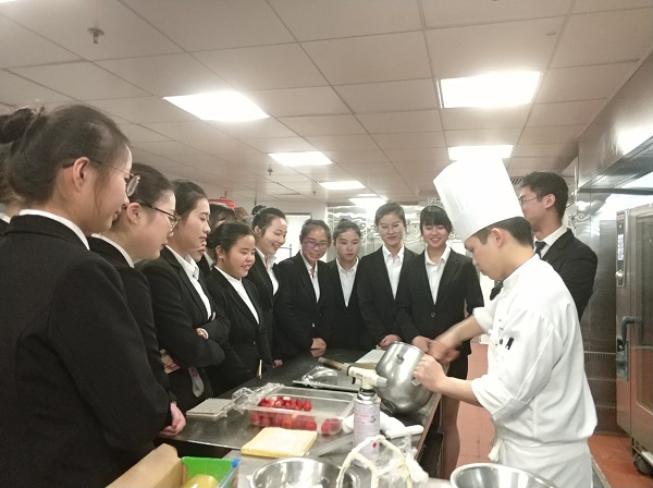 在酒店工作人员的带领下。同学们分为三组,依次参观了酒店的前厅部、客房部和餐饮部,并亲自参与尝试了餐饮部的餐饮摆台以及制作草莓奶油蛋糕的过程。