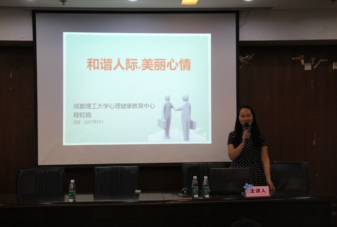 讲座邀请到了成都理工大学心理健康教育中心主任程虹娟副教授主讲。程老师用一个生动有趣的手指游戏互动开场,从心理学的角度,解读人际关系对大学生的重要意义,分析当前大学生人际关系存在的主要困惑,并通过丰富翔实的案例从四个方面和同学们分享了建立和谐人际关系,保持美丽心情的技巧:第一,接纳自己,自我和谐才能和谐他人;第二,尊重界限,把自己和他人分开;第三,培养自己的人际亲和性;第四,学会接受与求助,学会放手。