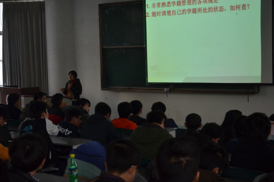 大会开始后,邹书蓉先就“什么是学籍”以及“怎样才能取得学籍”对2014级同学进行的系统而深入的讲解,并详细概述了有关学籍管理涉及的内容及相关事项。邹书蓉通过“与考试相关的重要规定”、“学籍黄牌警告、红牌与退学”、“关于考试纪律”、“关于重修学分”、“学位授予”这五个方面,向同学们强调了在管理自己学籍时应该注意的事项并要求同学们务必引起重视。她说,同学们应该在步入大学后能够及时改变自身的观念,在积极探索新生活的同时也应不忘学习好自己的专业知识,努力成为一个优秀的大学生,充分利用大学这个平台去展现自己。并且,要在任何时候都做个清醒的明白人。