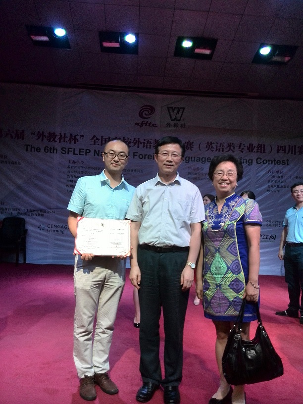 【本网讯】6月6-7日,由教育部高等学校外国语言文学类专业教学指导委员会、教育部高等学校大学外语教学指导委员会、教育部职业学校外语类专业教学指导委员会、四川省高校外语教学研究会、四川师范大学和上海外教育出版社联合主办的第六届“外教社杯”全国高校外语教学大赛(英语类专业组)四川赛区复赛和决赛在四川师范大学狮子山校区进行。共有省内高校英语专业组24名教师和商务英语专业组11名教师参加比赛。我校外国语学院周杰老师参加了英语专业组的比赛。经过激烈角逐,周杰老师进入决赛并获得二等奖。这是外国语学院教师在全国高校外语教学大赛中取得的又一佳绩。