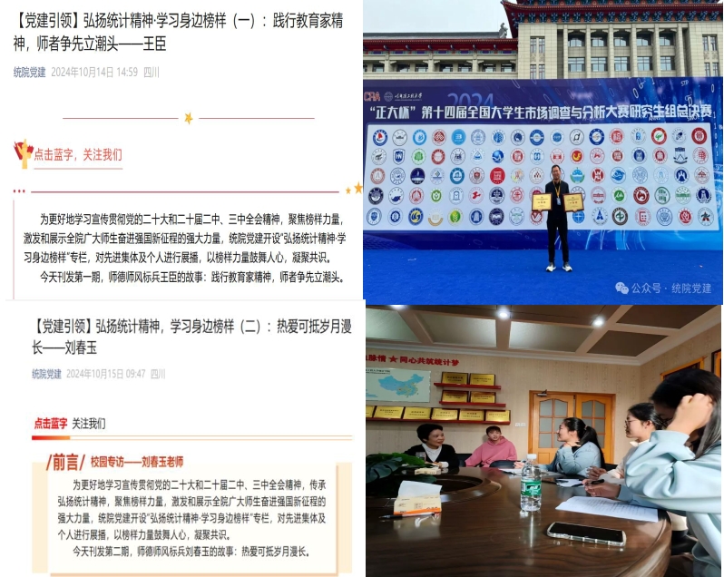 注重宣传教育是发挥思想引领的重要抓手。除了线下的学习提升之外,学院党委专门开设了“统院党建”微信公众号,以此作为学院党委进行思想政治引领的线上窗口。本号设置了“时政热点”、“党史学习”、“统计天地”、“学院党建”、“榜样力量”等专栏,将党建、业务与育人充分结合,年内共发布推文50余篇。其中,五期榜样人物引领篇目的阅读量超过1400人次。