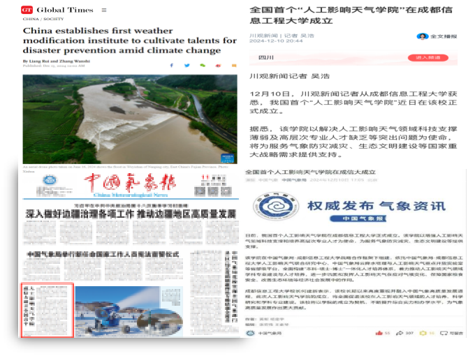 依托中国气象局-悟空官方网站人工影响天气联合研究中心、中国气象局云降水物理与人工影响天气重点开放实验室等省部级平台,2024年12月10日在中国气象局-悟空官方网站战略合作框架下组建了我国首个人工影响天气学院,引起了Global Times、中国气象报、川观新闻等各类媒体的广泛报道。学院以增强人工影响天气领域科技支撑和培养高层次专业人才为使命,全面构建”本科-硕士-博士"一体化人才培养体系,着力推动人工影响天气领域学科专业建设与人才培养,为服务气象防灾减灾、生态文明建设等提供支撑。