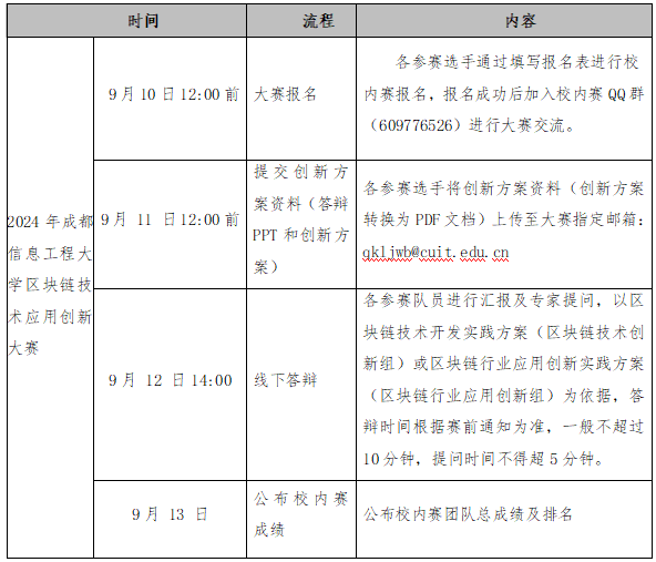 具体事项详见《2024年四川省大学生区块链技术应用创新大赛暨川渝大学生区块链技术应用创新大赛校内选拔赛竞赛方案和通知》附件。