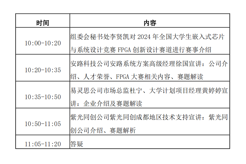 为提高参赛选手竞赛水平,贯彻以赛促教、以赛促学方针,组委会携手本届大赛出题单位安路科技、易灵思、紫光同创等公司于2024年9月20日(周五)在悟空官方网站举办2024年全国大学生嵌入式芯片与系统设计竞赛FPGA创新设计赛道校园宣讲会,现将有关事项通知如下: