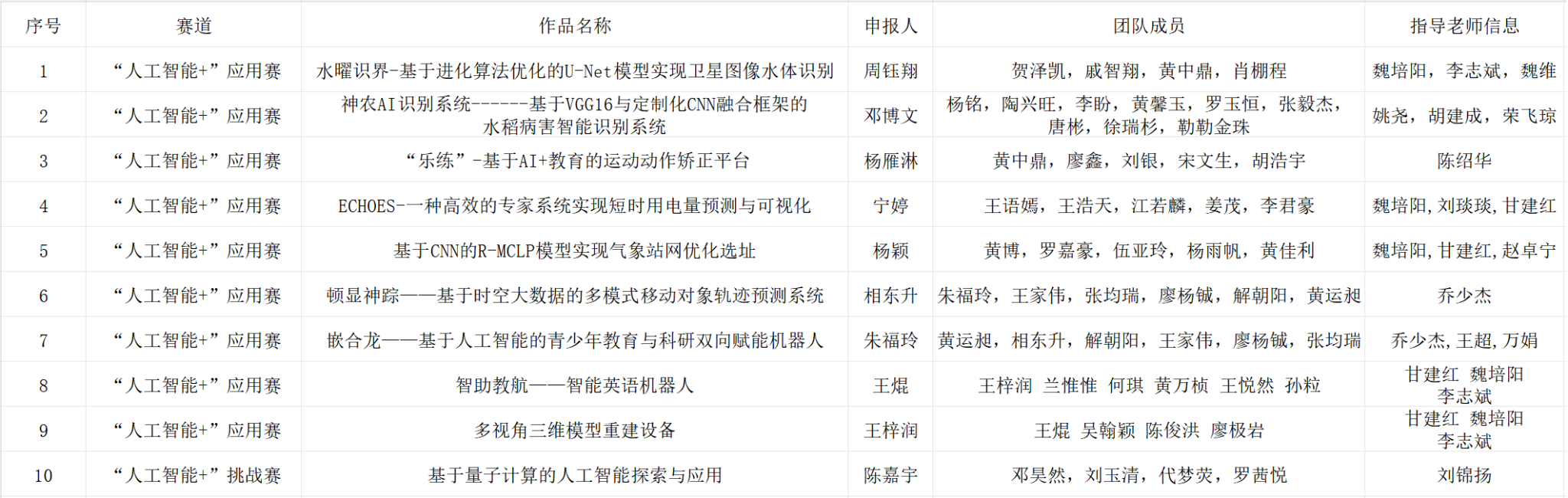 根据《关于开展第十九届“挑战杯”全国大学生课外学术科技作品竞赛的通知》等上级团组织工作要求,经过团队申报、学校审核,我校共10件作品拟推荐参加第十九届“挑战杯”全国大学生课外学术科技作品竞赛“人工智能+”专项赛,现对项目名单予以公示,名单如下: