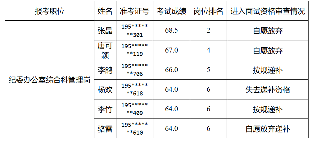 因本次公开选调中,纪委办公室综合科管理岗2人,自愿放弃面试资格审查,根据《悟空官方网站关于2025年公开选调工作人员公告》,现递补2名考生进入面试资格审查,具体情况如下: