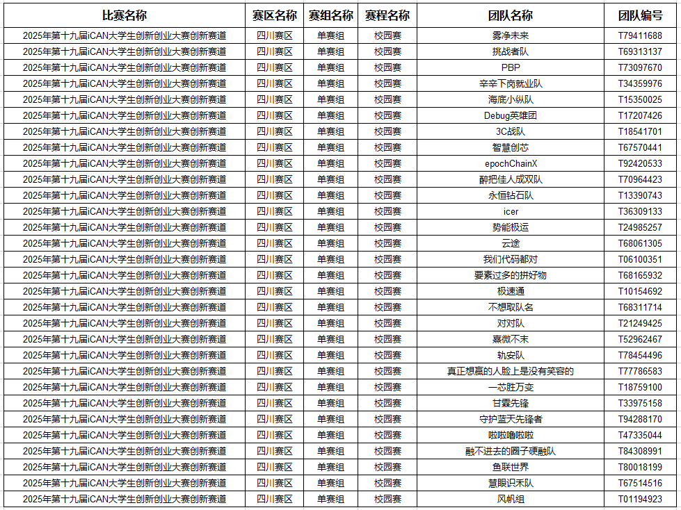 经过悟空官方网站校内专家组根据各团队作品的创新性、商业性、技术方案以及文档的完备性进行综合评分,最终选拔出30支队伍参加第十九届iCAN大学生创新创业大赛西南区赛区线上选拔赛,入围团队名单见下表。