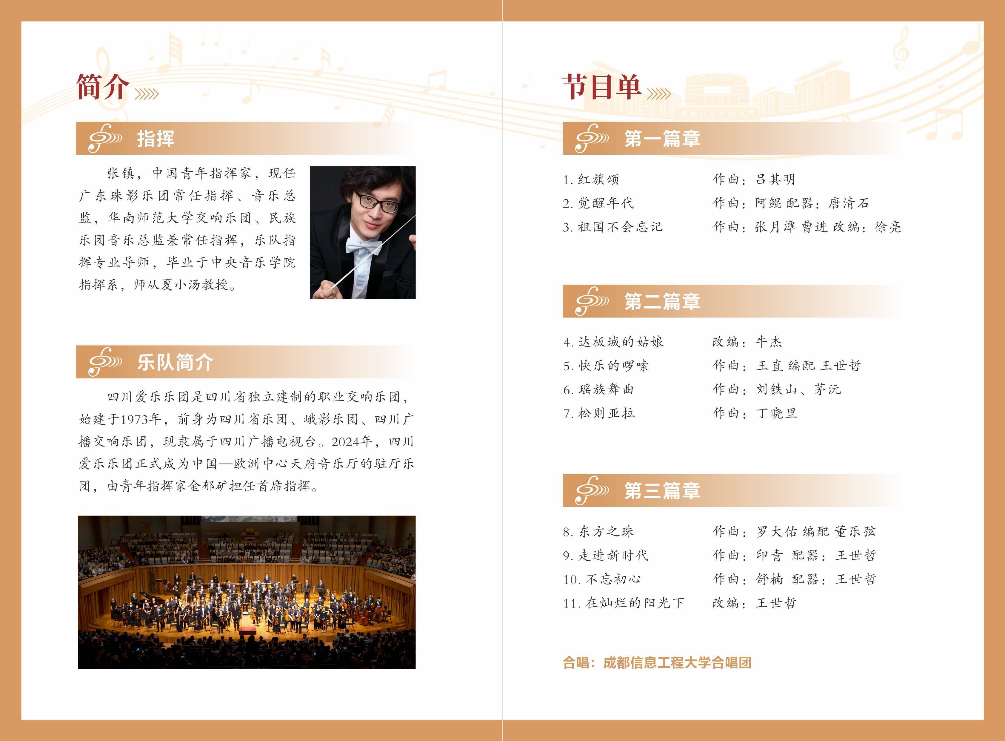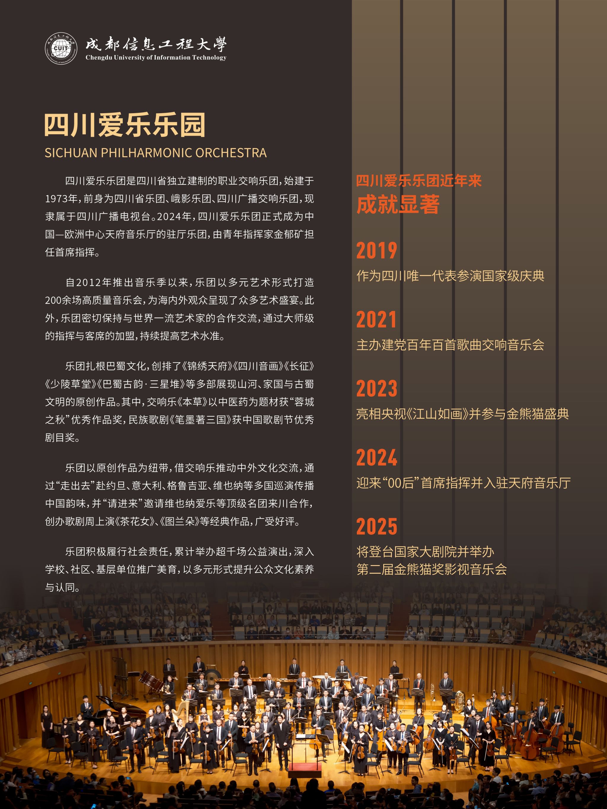 为弘扬中华美育精神,丰富校园文化生活,提升师生艺术素养,感受高雅艺术的独特魅力,我校特邀四川爱乐乐团走进校园,举办“乐颂中华歌盛世,美育成信润芳华”专场交响音乐会。届时,艺术家们将用精湛的技艺和饱满的热情,为我们奏响时代华章。精彩即将上演,诚邀广大师生共赏音乐盛宴!