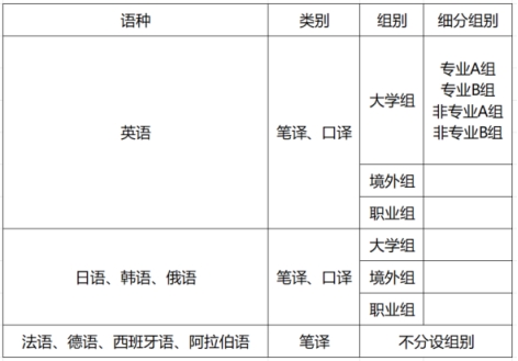 赛事分为笔译和口译。其中,笔译开设语种为英语、日语、韩语、俄语、法语、德语、西班牙语、阿拉伯语;口译开设语种为英语、日语、韩语、俄语。