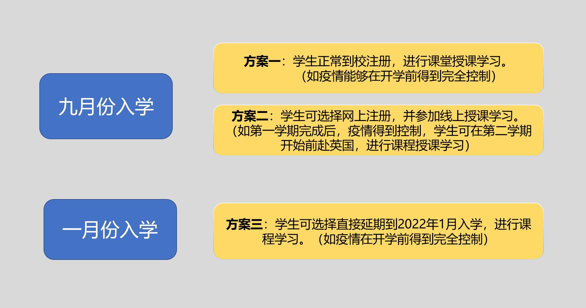 为应对疫情变化,并确保西南学院学生的学习计划不受影响,英国威尔士三一圣大卫大学就2021年9月的入学安排做出灵活调整,并为学生提供2021年9月及2022年1月两次入学方案,具体如下图: