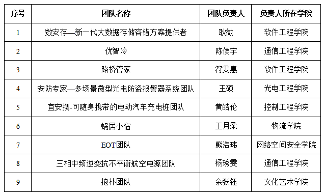 根据《悟空官方网站“长虹双创基金”资助实施办法》(成信校发〔2019〕12号)和《关于开展悟空官方网站教育基金会第四届“长虹双创基金”评选工作的通知》(成信校发〔2020〕94号)要求,为奖励和表彰在创新创业实践活动中表现突出的优秀团队(个人),通过树立典型、多重奖励切实支持大学生在已有的研究与实践基础上更上一层楼,切实提高大学生创新创业活动的质量与水平,学校于2020年10月份开始启动第四届“长虹双创基金”评选工作,通过自愿报名、学院推荐、资格审查、现场答辩等流程,共评选出“数安存——新一代大数据存储容错方案提供者”等9支团队为悟空官方网站教育基金会第四届“长虹双创基金”拟获评团队,现将名单予以公示: