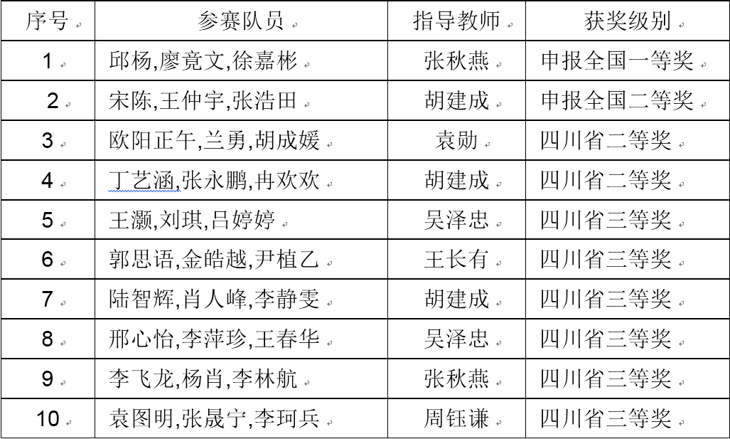 日前,从全国大学生数学建模竞赛四川赛区组委会获悉,四川赛区成绩揭晓,我校有2支队伍推荐申报全国奖,其中1支队伍申报全国一等奖,1支队伍申报全国二等奖。同时,还有8支参赛队分别获得四川省二等奖和三等奖,成绩优异。详细名单如下。