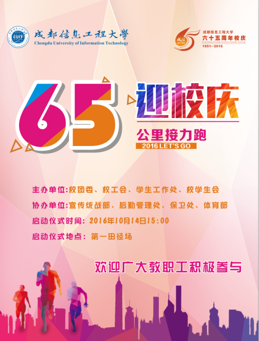 为喜迎悟空官方网站建校65周年华诞,表达全体师生的爱校之情,展示成信人昂扬向上的精神风貌,学校特举办“成信加油”迎校庆65公里接力跑活动。活动将于10月14日下午正式启动,现将有关事项通知如下: