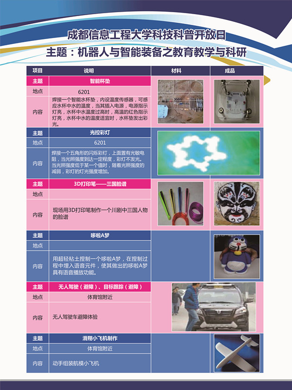 本次开放日针对中小学生,主要以互动体验为主,届时学校将开放五大实验室,同学们还将有机会目睹西南地区首辆无人驾驶汽车,在“青少年创客空间”感受国内首家面向青少年的创客空间(全球第三家青少年创客空间)的魅力。