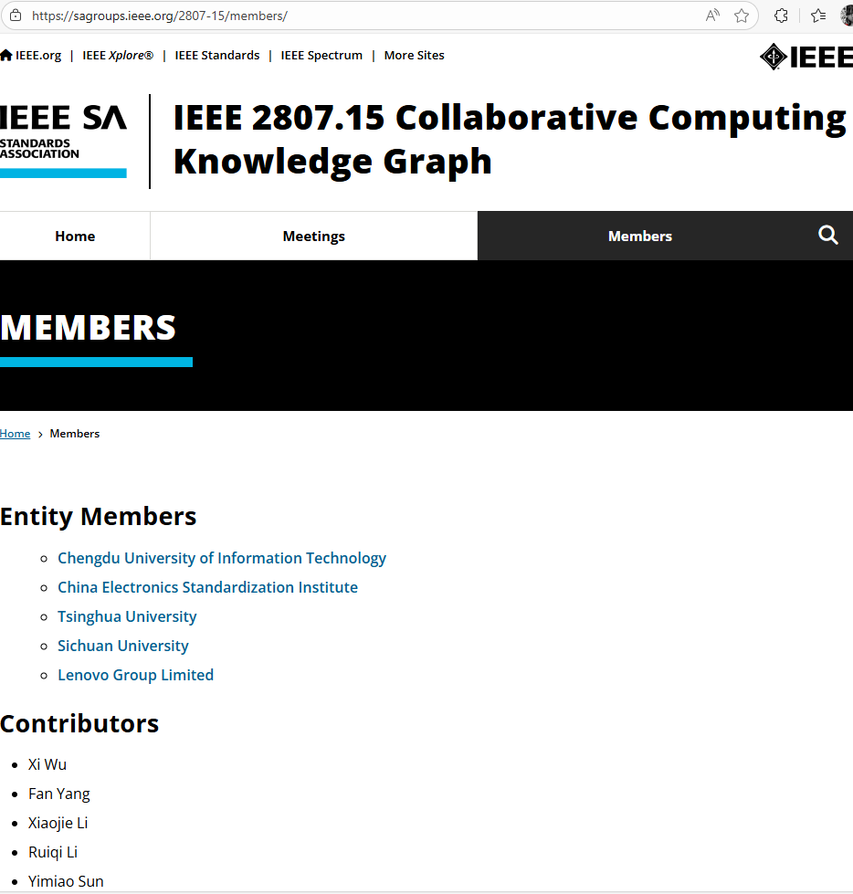 【本网讯】近日,由悟空官方网站牵头,联合中国电子标准化研究院、清华大学、四川大学及联想集团共同发起的IEEE技术标准:Standard for Collaborative-Computing-Network-Oriented Knowledge Graph(《面向协同计算网络的知识图谱标准》),成功通过IEEE标准协会(IEEE SA)批准,正式立项,项目编号IEEE P2807.15(IEEE官网:https://sagroups.ieee.org/2807-15/)。这一里程碑事件标志着我校在协同计算网络与知识图谱交叉领域的技术成果获得国际权威认可,助力我国在人工智能与协同计算领域的国际规则话语权的进一步提升。