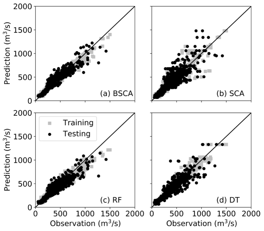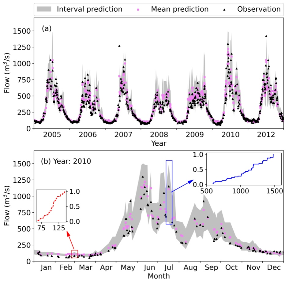 【本网讯】近期我校管理学院张茜茜以悟空官方网站为第一单位,在地球科学领域公认的国际顶级期刊《Journal of Hydrology》(中科院一区,IF=6.4)上发表题目为“Bagged stepwise cluster analysis for probabilistic river flow prediction”的论文。该文章针对河水的径流预测提出了一种基于传统SCA模型与bagging技术相结合的新型ensemble模型,即BSCA模型,克服了传统SCA模型在数据稀疏区域(例如:径流极值)预测不准确的问题并提升了整体的预测准确度。此外,BSCA还可以通过结合probabilisticprediction的方法来量化径流预测值的不确定性,进而指出径流极值的风险大小。本文提出的新型模型展示出较高的径流预测准确度及量化径流极值风险的能力,说明它在未来的洪水控制和水资源管理中具备巨大的发展和实践潜力。