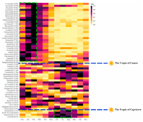 图1. 多年月平均流感高峰。采用Min-Max归一化方法将月平均IPR数据归一化到0-1的范围。蓝色的虚线是北回归线或南回归线。绿色的虚线框是北回归线以北和南回归线以南国家流感主峰。