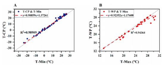 图2. 流感峰值的2m温度与每个国家的温度之间的相关性分析。T-CP/WP:冷季或暖季流感高峰的2m温度。T-Min/Max:各国的最低或最高2m温度。(A)冷季流感高峰的2m温度与最低2m温度之间的相关性。(B)暖季流感高峰2m温度与最高2m温度之间的相关性。