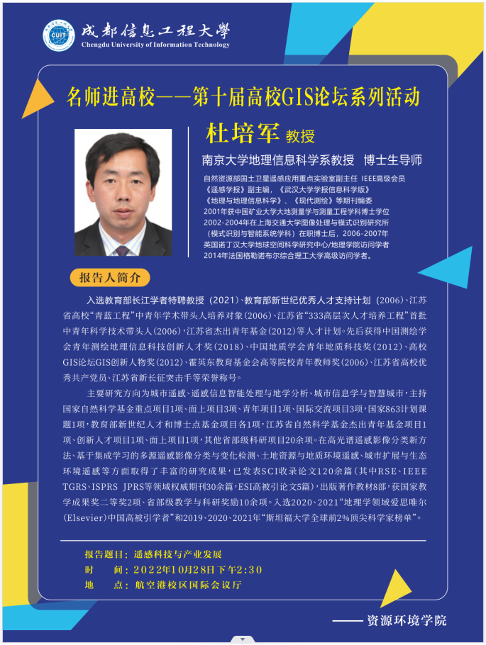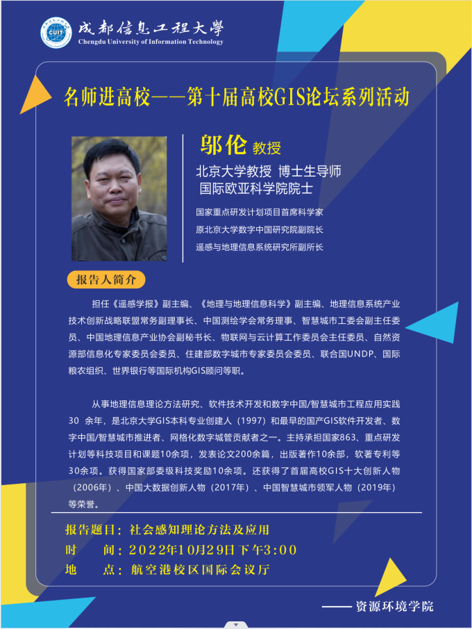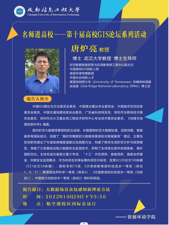 【本网讯】作为第十届高校GIS论坛系列活动之一,“名师进校园——悟空官方网站站”于2022年10月28日至29日在悟空官方网站航空港校区国际会议厅成功举行。此次学术活动由资源环境学院承办,科技处、研究生处给予了大力支持。活动由资源环境学院院长徐成华教授主持,来自北京大学邬伦教授、南京大学杜培军教授、武汉大学杨必胜教授和唐炉亮教授、深圳大学涂伟副教授多位名师走进我校,为地理信息科学、遥感科学与技术、测绘工程等专业的两百余名在读大学生和研究生奉献了一场有关地理信息科学、遥感、现代测绘的学术盛宴。