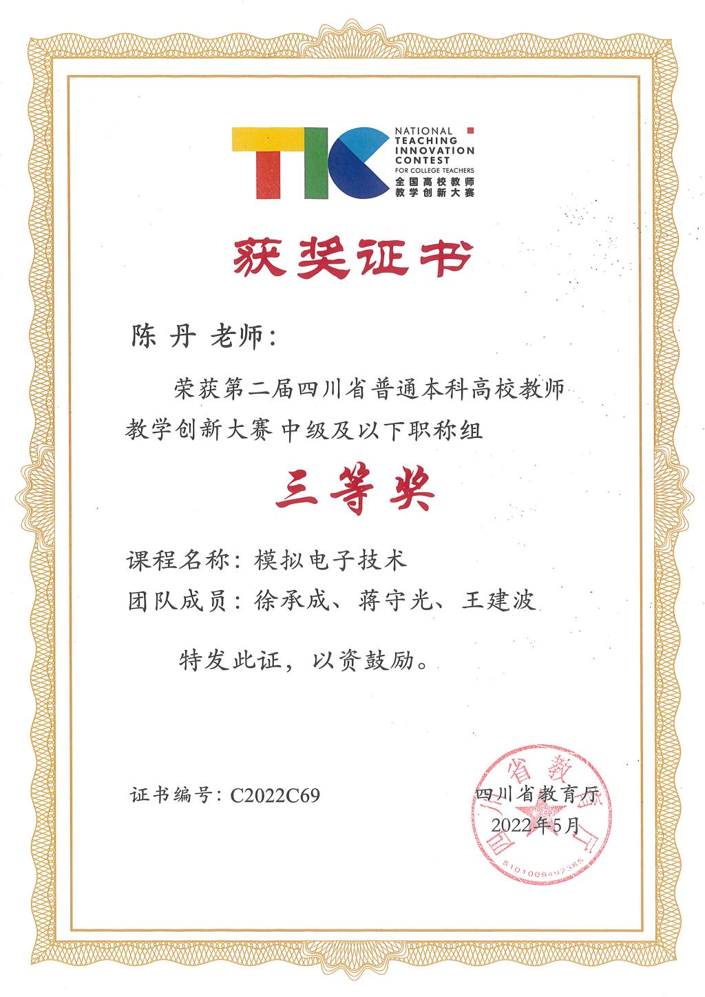 【本网讯】近日,四川省教育厅发布了第二届四川省普通本科高校教师教学创新大赛获奖名单。我校工程实践中心教师陈丹老师团队参赛的《模拟电子技术》课程荣获本届大赛四川省三等奖。