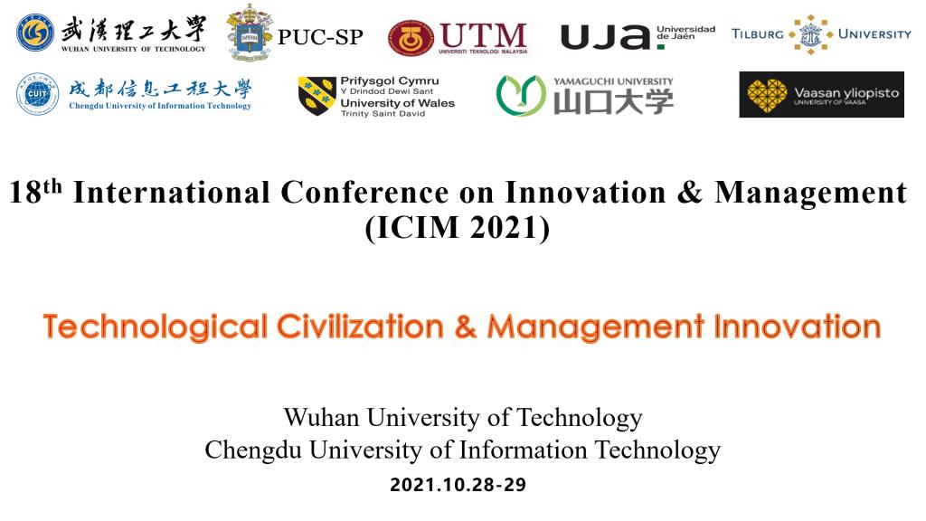 【本网讯】10月28日-29日,在我校的积极组织和支持下,第18届创新与管理国际学术会议(International Conference on Innovation & Management)(ICIM2021)成功在线举办。该会议每年举办一届,属于ICCA(国际大会与会议协会)标准认证的国际协会会议。本届会议以“科技文明与管理创新(Technological Civilization & Management Innovation)”为主题,由悟空官方网站、武汉理工大学、荷兰蒂尔堡大学、日本山口大学、巴西圣保罗大学、马来西亚理工大学、芬兰瓦萨大学、英国威尔士三一圣大卫大学、西班牙哈恩大学联合主办,我校管理学院承办。
