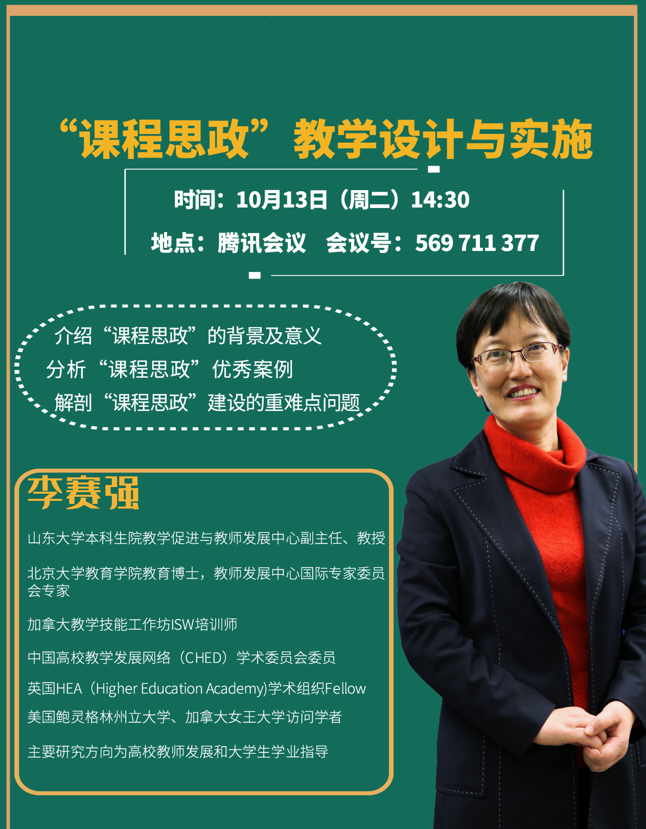 本次讲座特邀山东大学本科生院教学促进与教师发展中心副主任李赛强教授,围绕“课程思政”的背景与意义、优秀案例分析、“课程思政”的重难点问题解剖等内容开展培训。李赛强教授在本次讲座中引导参培教师深入理解“课程思政”在课程育人和教学质量提升中的意义,从具体案例着手梳理归纳“课程思政”教学目标的确立、教学设计和实施策略等基本原则,结合学科特色分析如何挖掘课程和教学方式中蕴含的思想政治教育资源,分析解剖“课程思政”建设的重点和难点问题,反思教师提升“课程思政”意识和能力的途径。