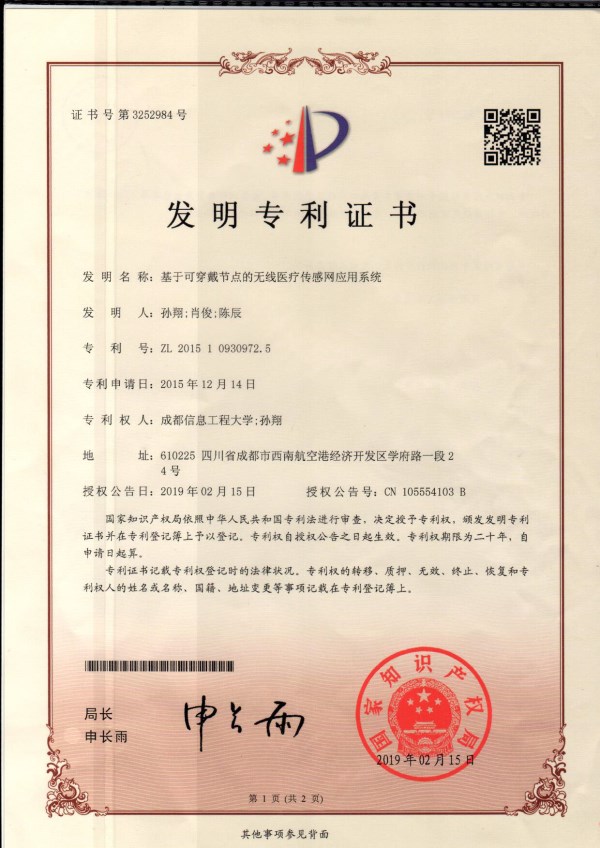 1.基于可穿戴节点的无线医疗传感网应用系统,发明专利,专利号201510930972.5,已授权。