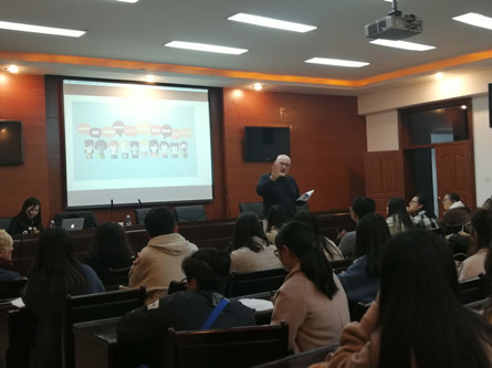 【本网讯】11月6日,美国东门诺大学历史系、MPC(Mennonite Partners in China)主任、跨文化研究以及比较文化研究博士白牧仁(Myrrl Byler)先生应邀来校作了题为“肩并肩:语言与身份”的学术讲座。文化艺术学院汉语国际教育、汉语言文学专业100余名学生,部分专业教师参加了讲座。讲座由文化艺术学院许有平老师主持。