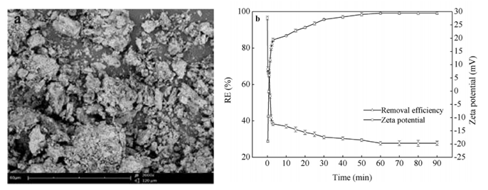 负载亚砷酸盐的生物絮凝剂的扫描电子显微镜分析(a); 亚砷酸盐去除过程中的Zeta电位和亚砷酸盐去除效率(b)