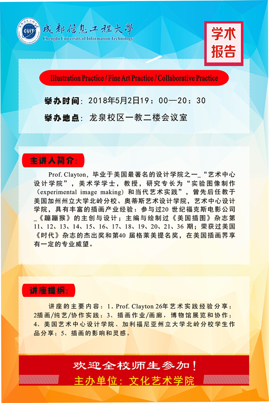 上一条:美国艺术中心设计学院Clayton教授应邀到我校举办学术讲座