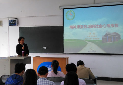 【本网讯】近日,应我校文化艺术学院的邀请,四川大学华西心理卫生中心精神康复专家邓红教授在我校龙泉校区1303教室,举办了题为《精神健康领域中的社会心理康复》的学术讲座。学院社会工作与社区发展研究所全体老师,社会工作专业本科生、研究生100余名学生聆听了讲座。讲座由文化艺术学院副院长徐砺主持。