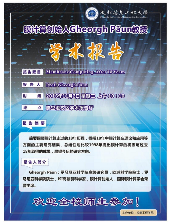 来源:控制工程学院 作者:蒲明日期:2016-10-31 审核:新闻中心 点击: