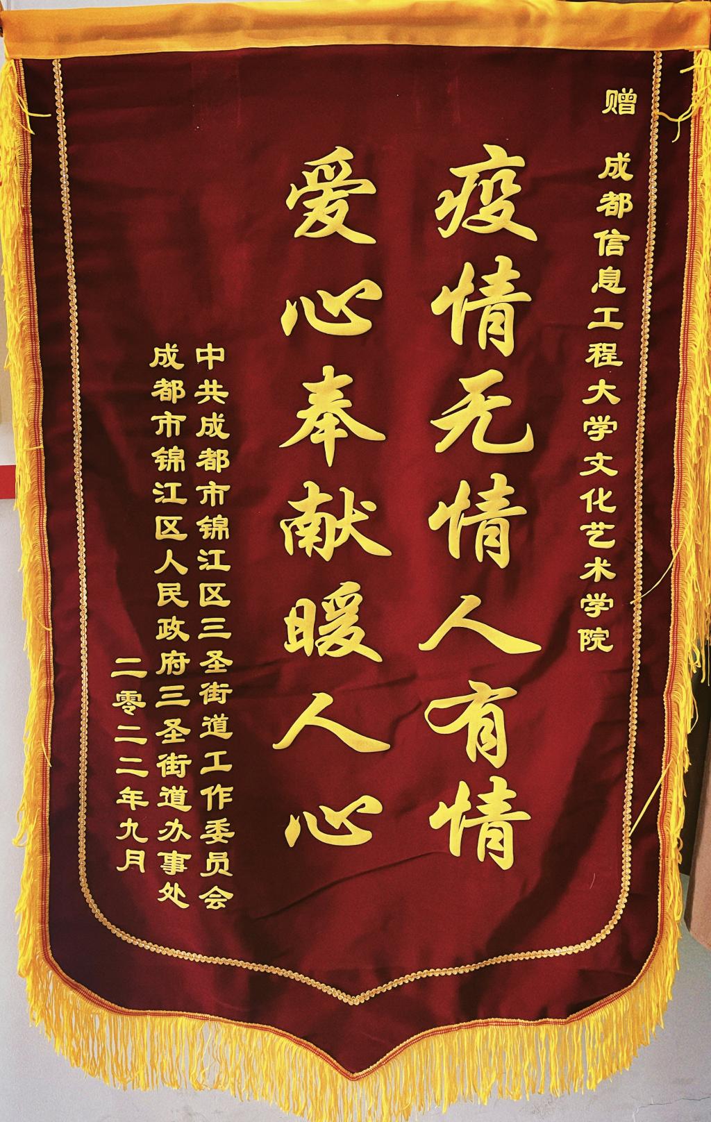 10月18日下午,悟空官方网站文化艺术学院、民主建国会悟空官方网站支部分别收到了锦江区人民政府三圣街道办事处送来的两面“疫情无情人有情,爱心奉献暖人心”锦旗,表达对学院、支部在成都“8.25”疫情爆发之时给予的帮助与支持表示谢意。