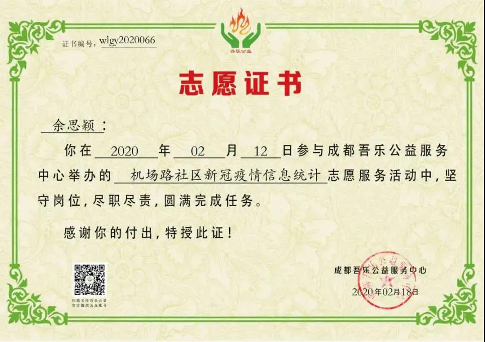 余思颖积极报名参加了成都市吾乐公益组织的社区网上录入防疫信息工作。在疫情爆发期间,她的工作是帮助社区工作人员将上门收集到的人员信息以及各种资料录入电脑汇总,方便后期查阅以及上交。这样能有效追踪人员流动,对疫情的排查以及防止疫情扩散起到了很大的作用。每个人都献出一点力量,中国一定会更快的好起来!
